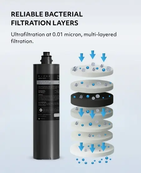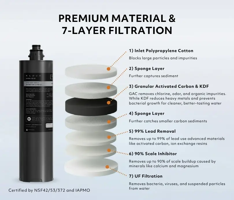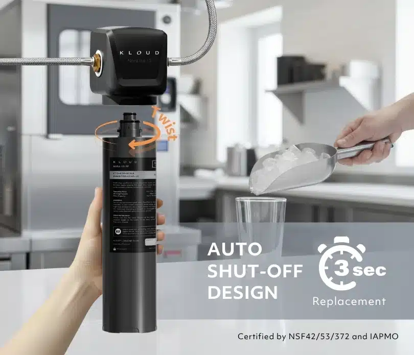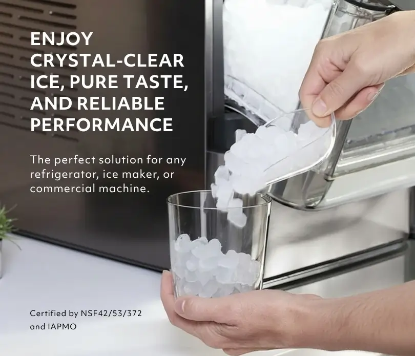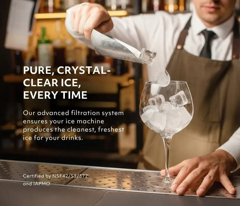 This advanced 6-level ice machine filter combines PP, carbon, and UF membrane filtration with KDF, 99% lead removal, and 90% scale inhibitor media for superior water purity. It effectively eliminates impurities, chlorine, and heavy metals while preventing scale buildup — ensuring crystal-clear ice, enhanced taste, and longer machine life